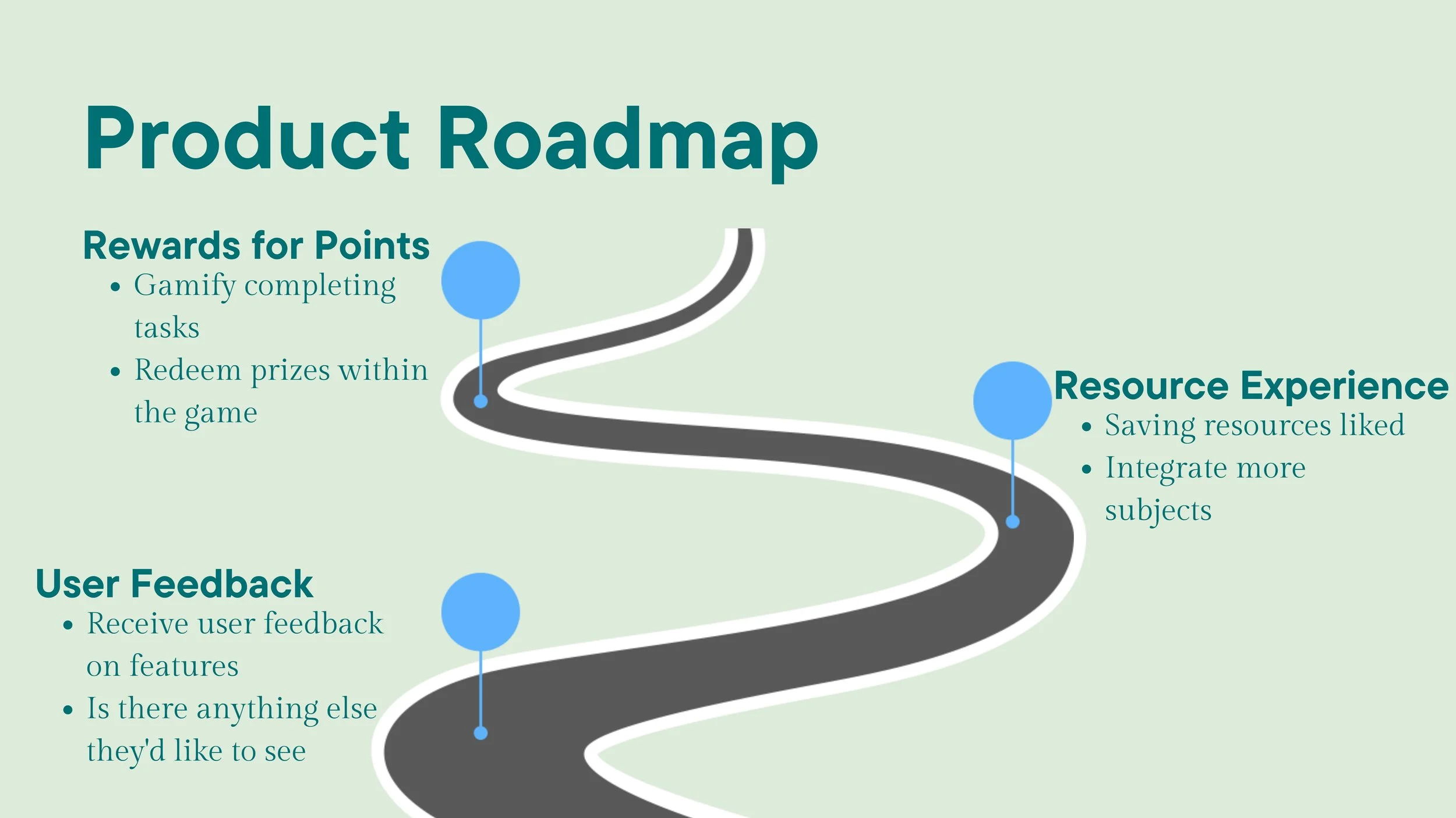 Our product roadmap outlines the potential for further development and iteration of the app. After launching, we plan to gather user feedback to understand their preferences, with a key priority being the addition of more gamification elements. This could include offering in-app rewards, such as real-life prizes or in-game incentives like new avatars, to enhance user engagement.