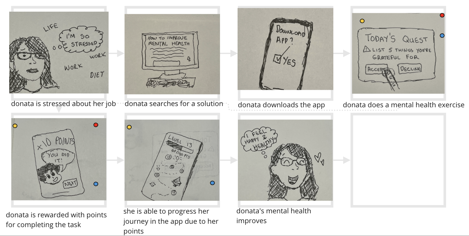 During the ideation phase, we created several storyboards to visualize the user journey and their emotional experience while interacting with the app. This exercise led us to recognize that incorporating gamification could enhance user satisfaction, as users would feel a sense of progress and achievement, similar to the rewarding experience of playing a game.